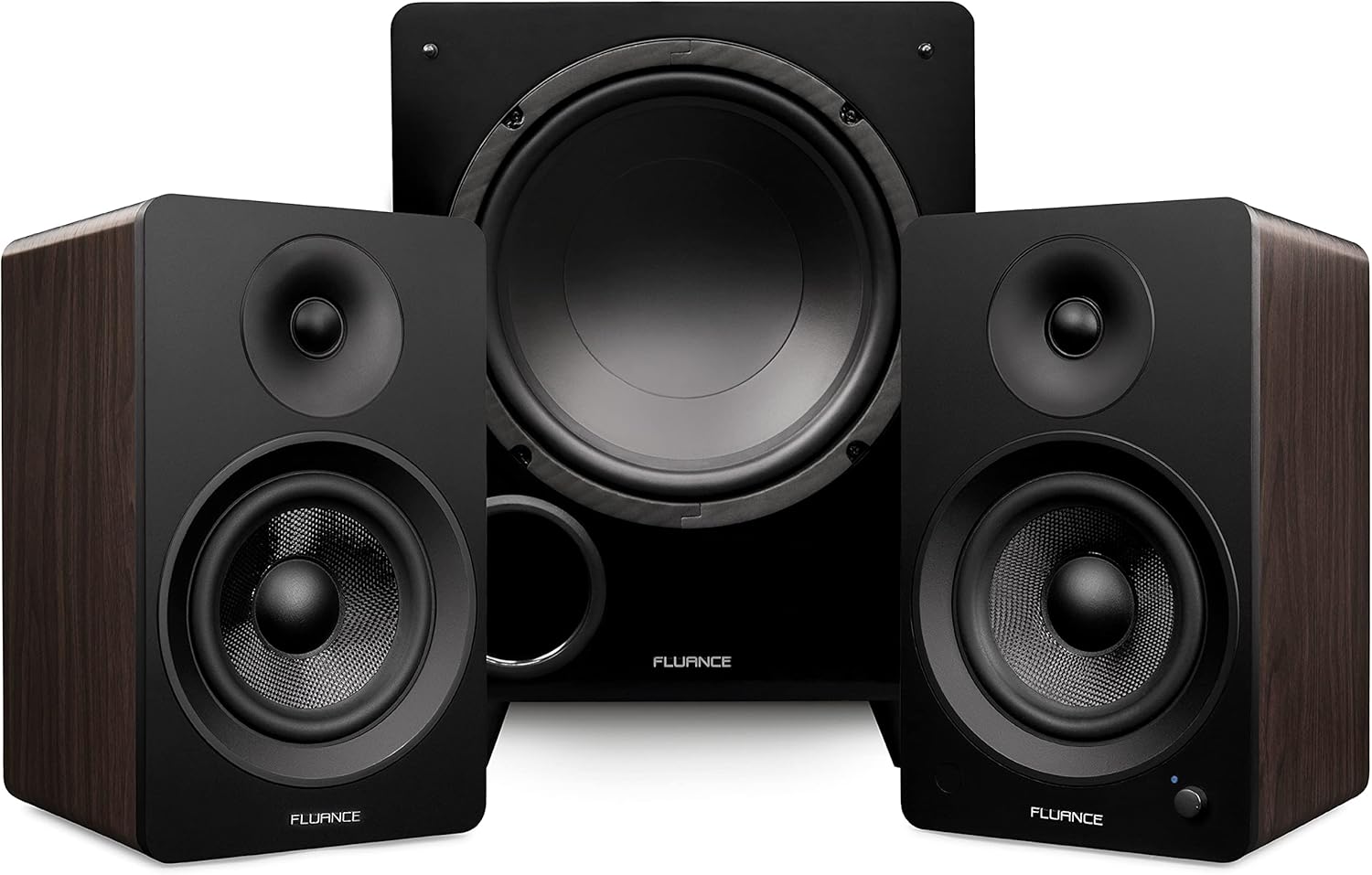 "Fluance Ai61 Powered 6.5"" Stereo Bookshelf Speakers and DB10 10"" Low Frequency Ported Front Firing Powered Subwoofer with 15 Feet RCA Ultimate Performance Collection Subwoofer Cable (Natural Walnut)"