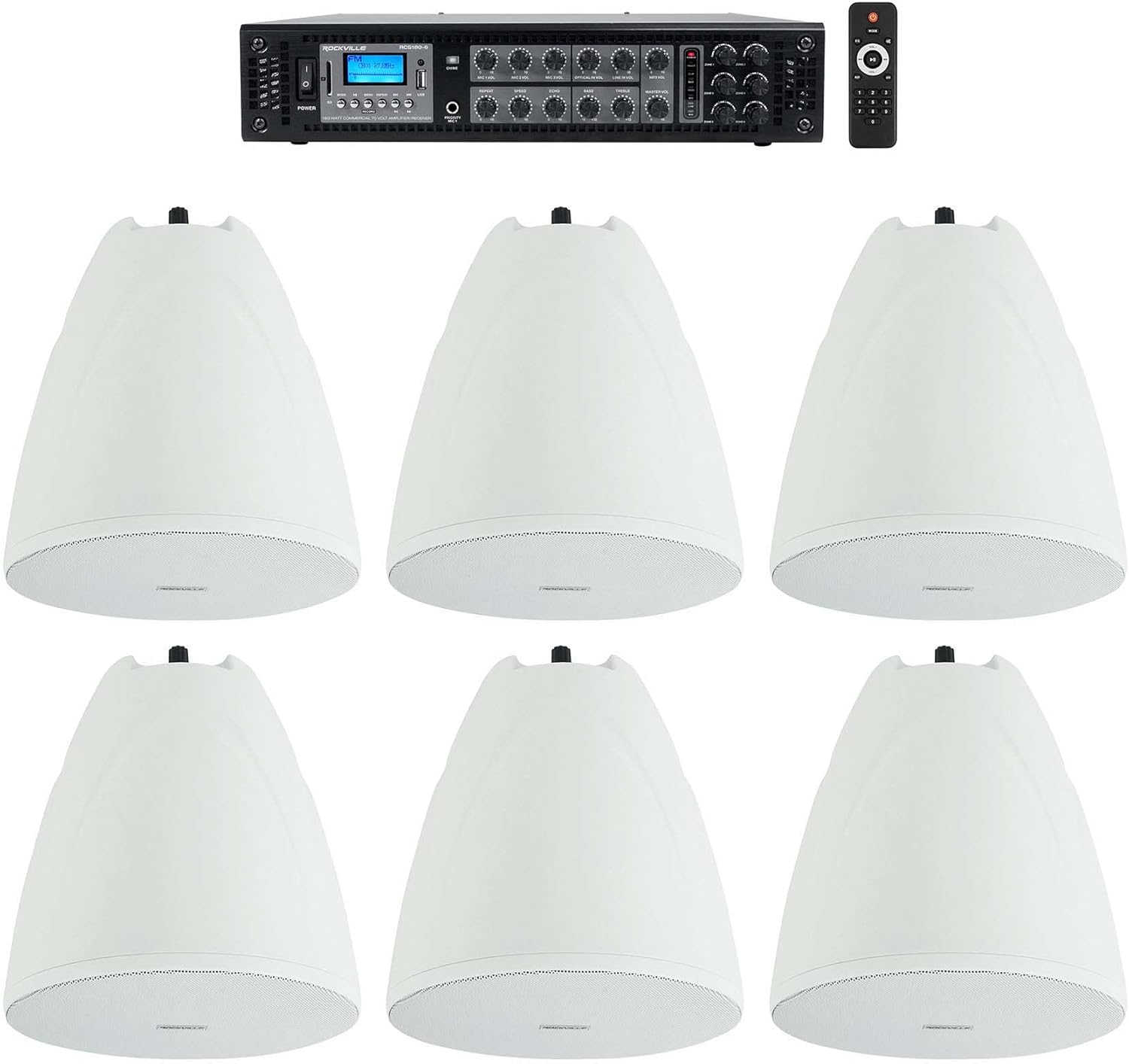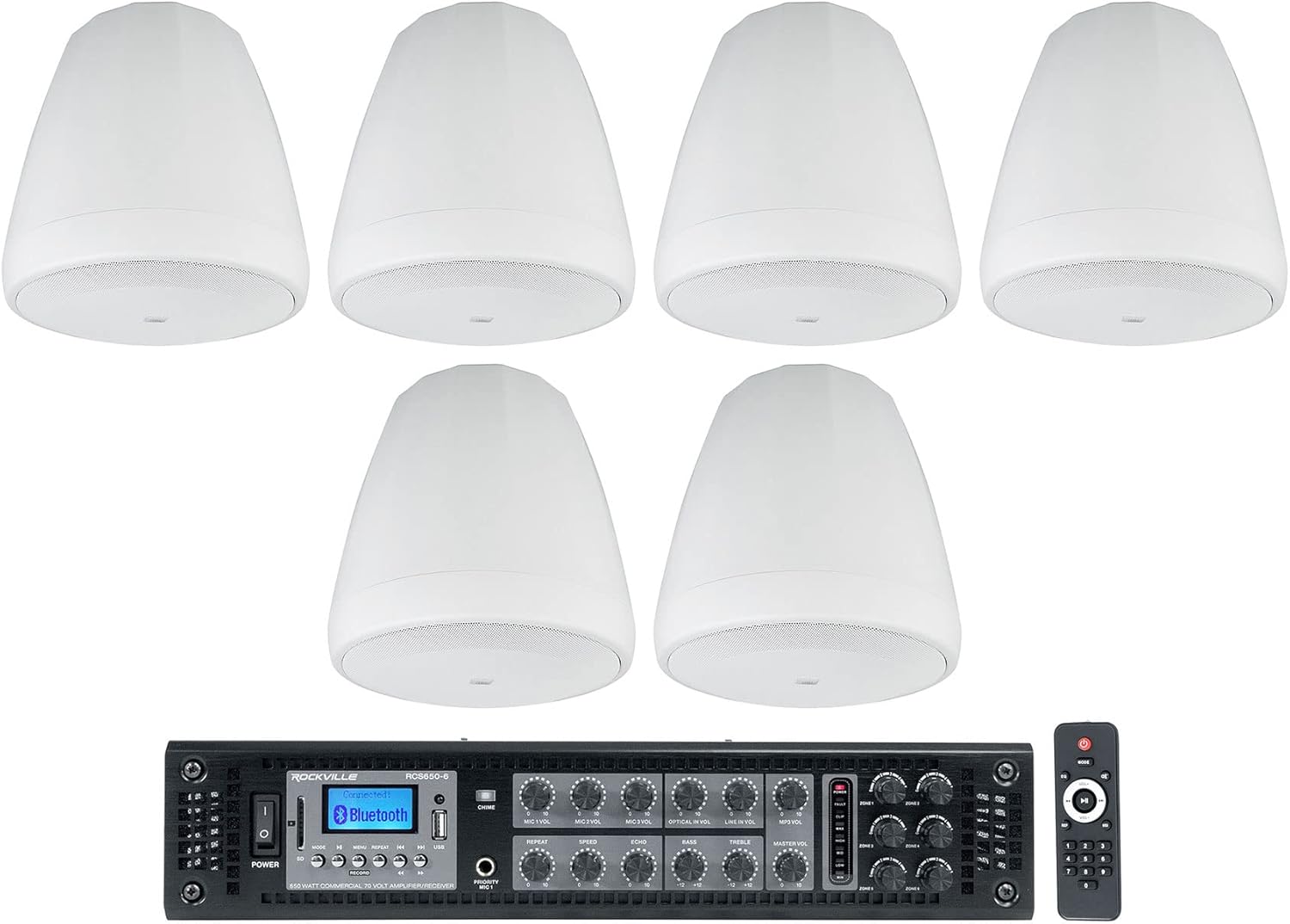 "Rockville Bundle: (1) RCS180-6 180 Watt 6 Zone 70v Commercial/Restaurant Amplifier/Bluetooth+(6) PEN-65T White 6.5"" 70V Hanging Pendant Speaker Commercial/Restaurant (7 Item)"