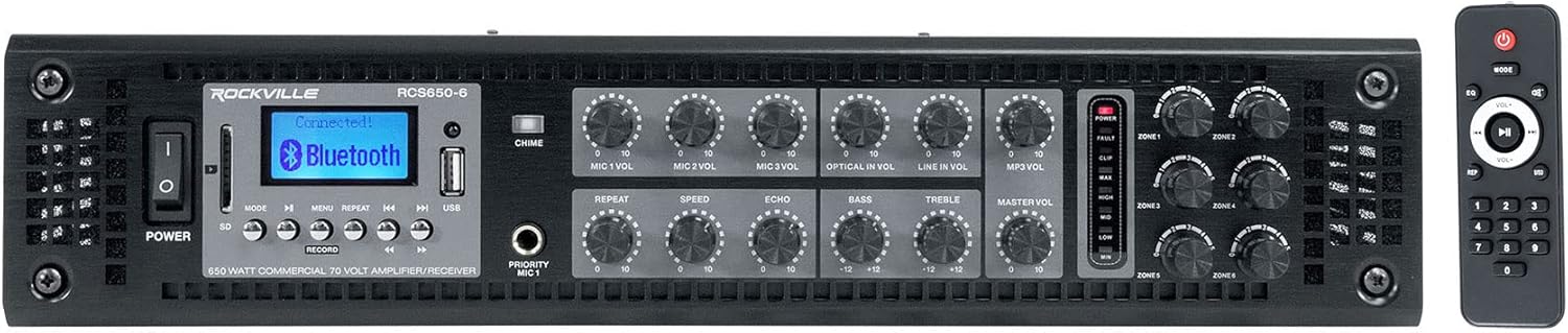 Rockville RCS180-6 Bundle: 180-Watt 6-Zone 70V Bluetooth Commercial Amplifier with USB SD FM