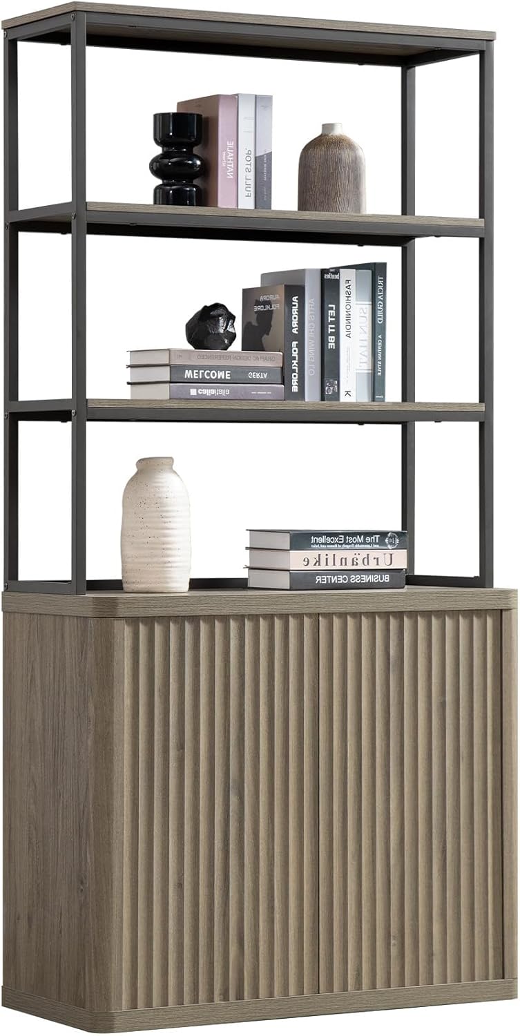 "SICOTAS Book Shelf Fluted Bookshelf 71"" Tall Bookcase with Doors Storage 5 Tier Mid Century Modern Bookshelves Large Shelves Metal Book Cases for Living Room Office Bedroom Kitchen Library"
