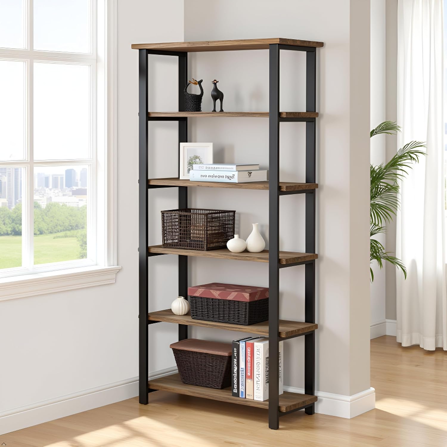 "Pomona 6-Tier Bookcase 70"" Tall Solid Wood with Metal Frame Bookshelf Durable Industrial Storage for Home Office