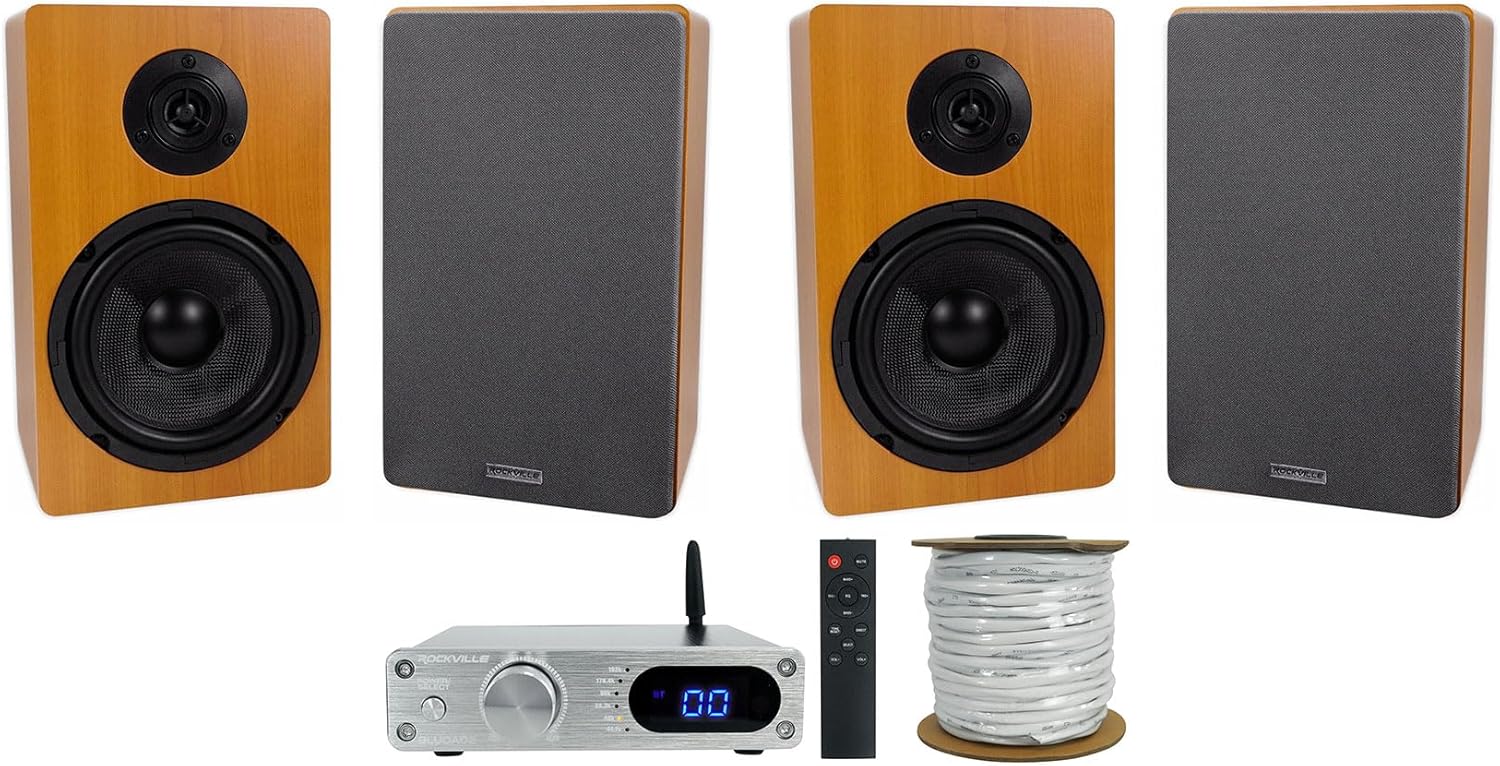 "Rockville Bundle: (2) Pairs of RockShelf 68C Classic 6.5"" Home Bookshelf Speakers w/Kevlar Woofers Bundle with BLUDAC2S DAC/Bluetooth Amplifier Receiver + CL2 12 AWG 100' CCA Speaker Wire (4 Items)"