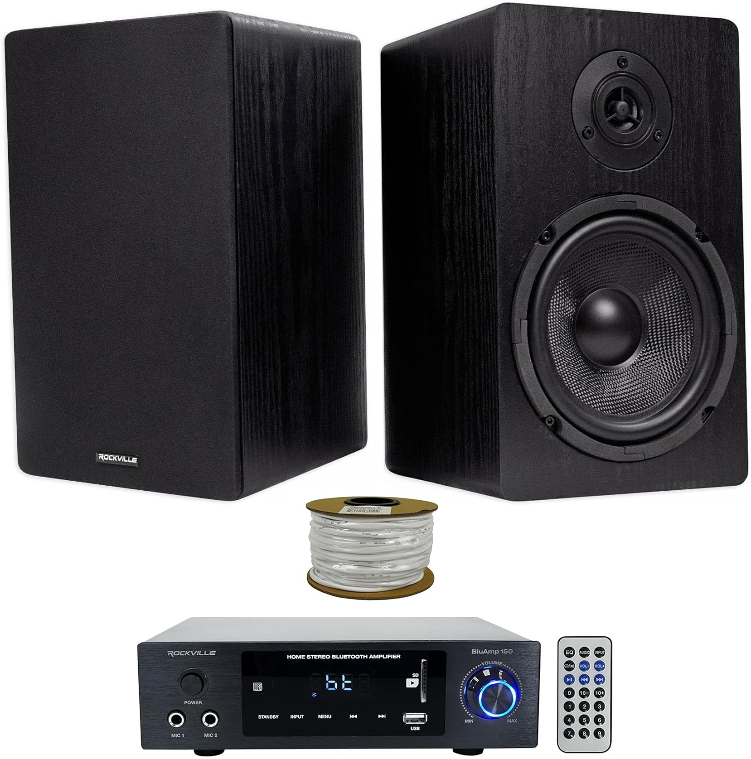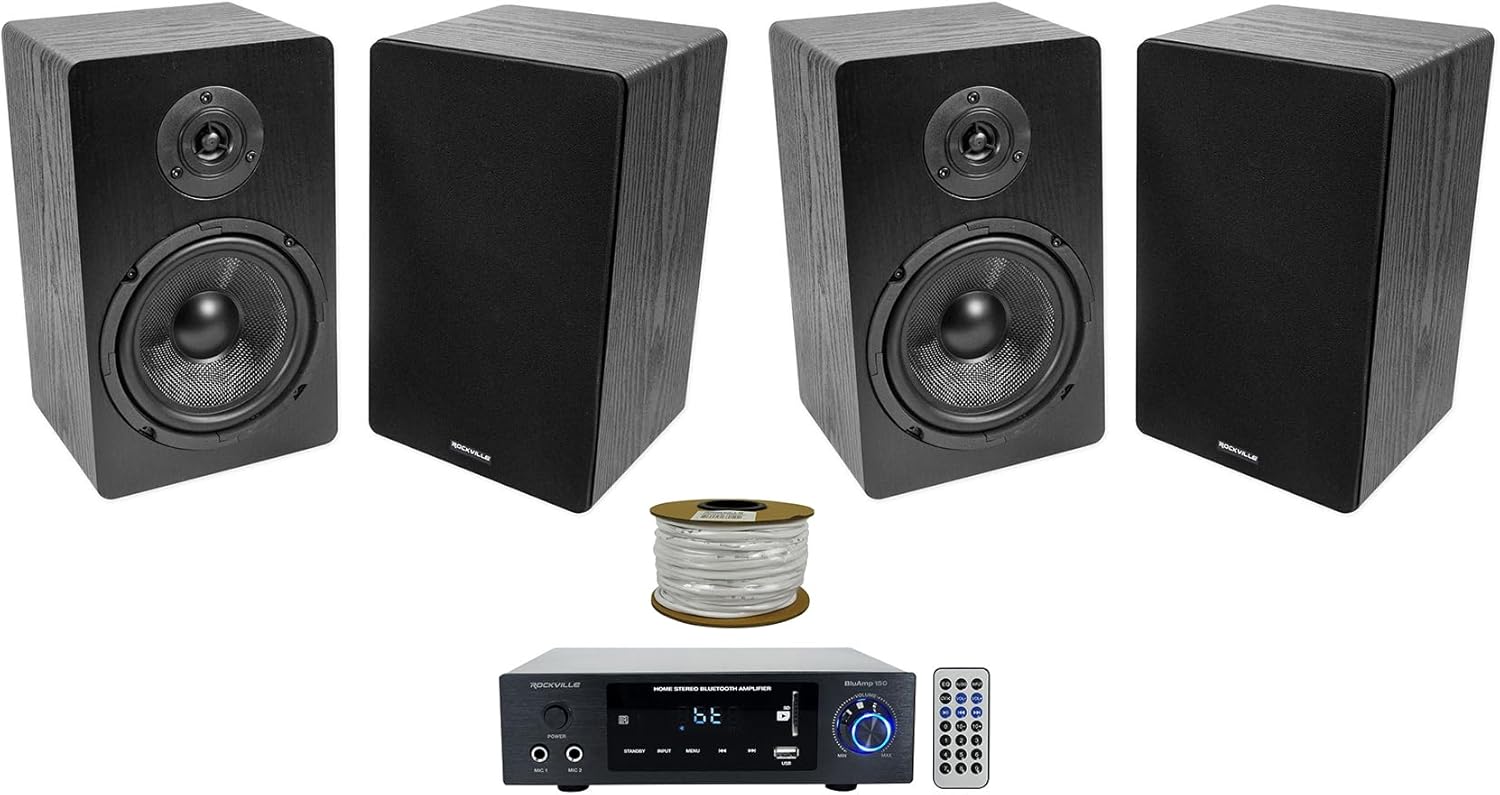"Rockville BLUAMP 150 Home Stereo Bluetooth Amplifier Receiver Bundle with (4) RockShelf 68B 400w Black 6.5"" Home Theater Bookshelf Speakers & Blue 14G50 OFC Speaker Wire (3 Items)"