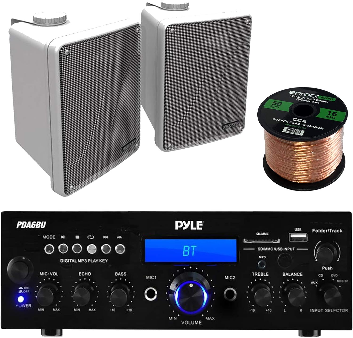 "Amp and Speaker Combo Packge: Pyle PDA6BU Bluetooth Radio USB AUX Amplifier Stereo Receiver Bundle with 2X Kicker 46KB6G 6.5"" Full Range Bookshelf Speaker + Enrock 50ft 16g Speaker Wire"