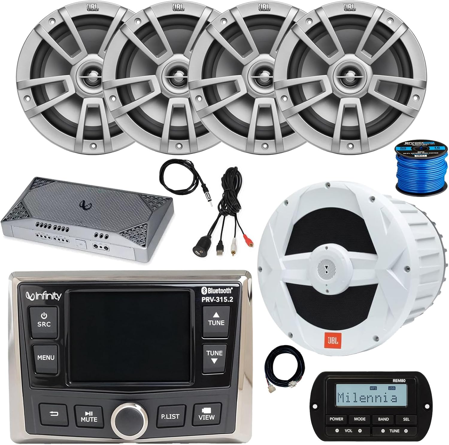 Great 21' - 29' Pontoon Boat Audio System: Bluetooth Radio Marine Receiver Bundle Combo with 4X 6.5 2-Way 225W OEM Replacement White Weather-Resistant Speakers