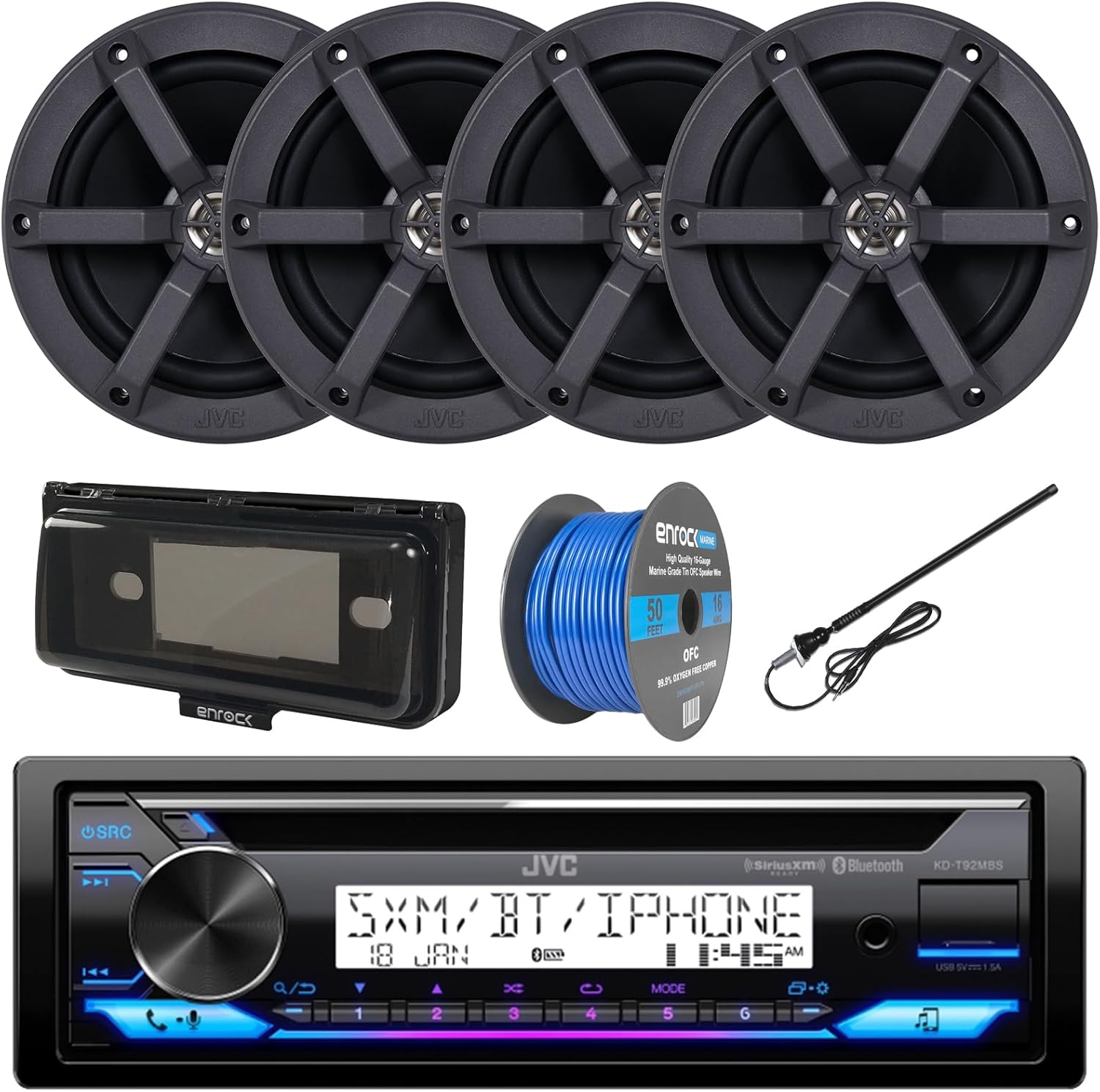 "Single DIN Headunit Bluetooth Radio USB AUX AM/FM CD Player Marine Receiver Bundle Combo with 2 Pairs (QTY 4) 6.5"" 2-Way 100 Watts Peak Boat Audio Speakers