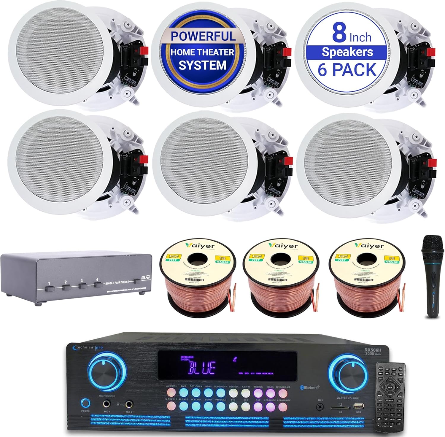 "Home Theater System Kit - 2000 Watts Bluetooth Amplifier w/ 6 Qty of 8"" Framed Ceiling Speakers 300 W Each
